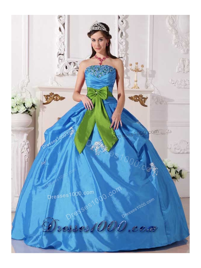 Aqua Puffy Gown Quinceanera Dress Strapless with Beading and Bow for 2014