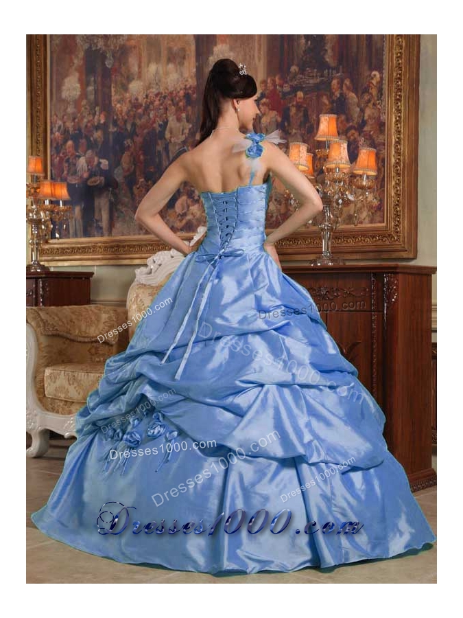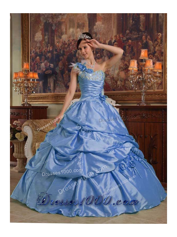 2014 Blue Quinceanera Dress Puffy One Shoulder with Hand Made Flowers and Beading