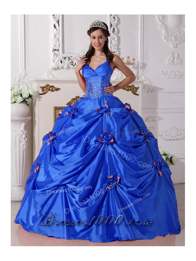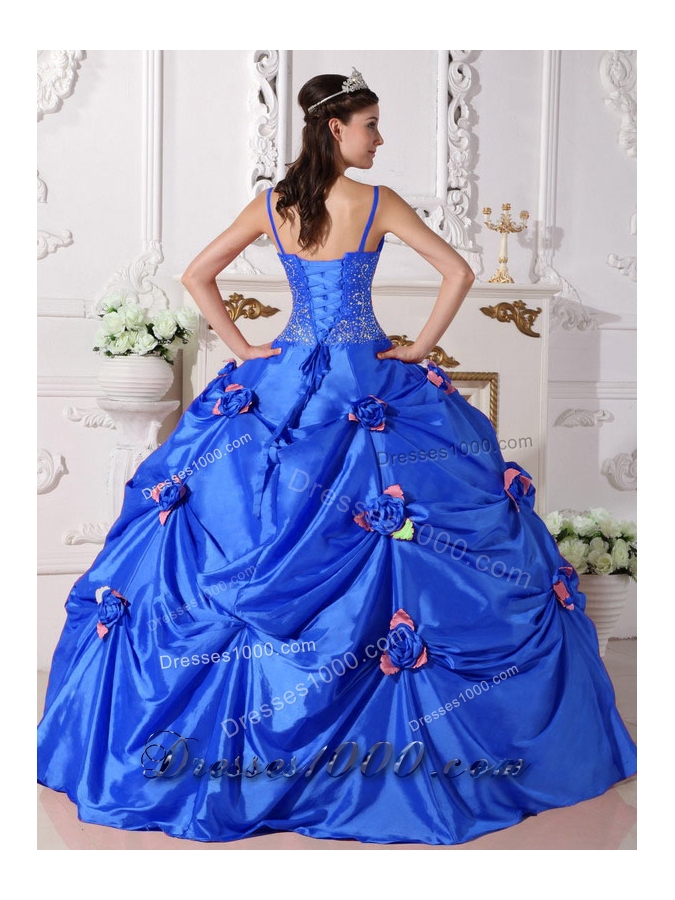 2014 Blue Puffy Spaghetti Straps Quinceanera Dress with Beading and Hand Made Flower
