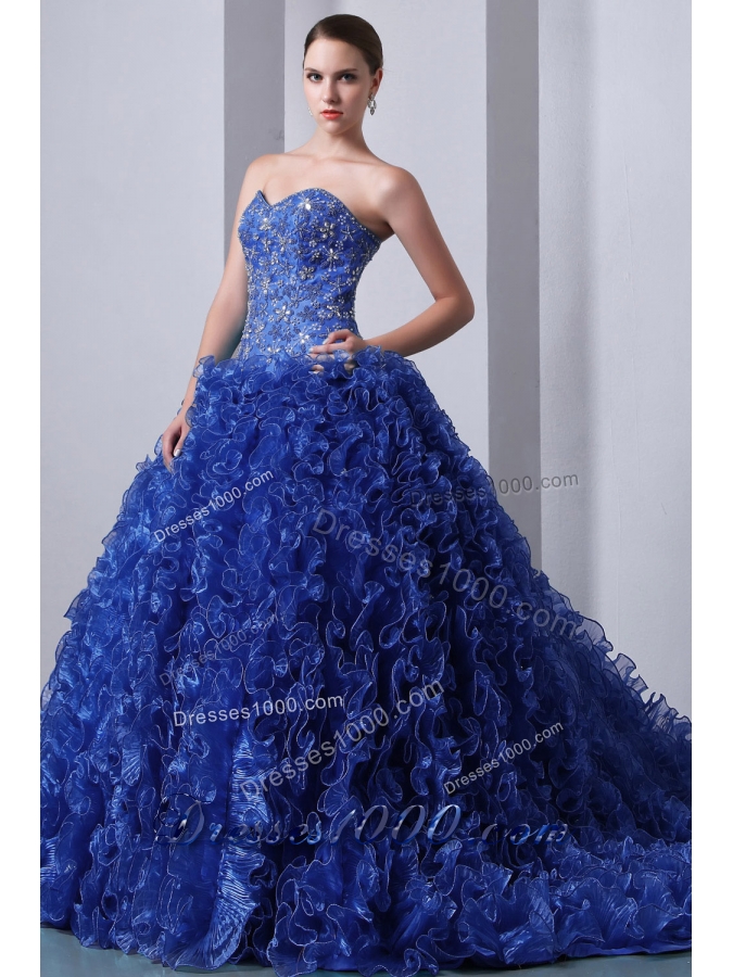 2014 Popular Blue Princess Sweetheart Brush Train Quinceanea Dress with Beading and Ruffles