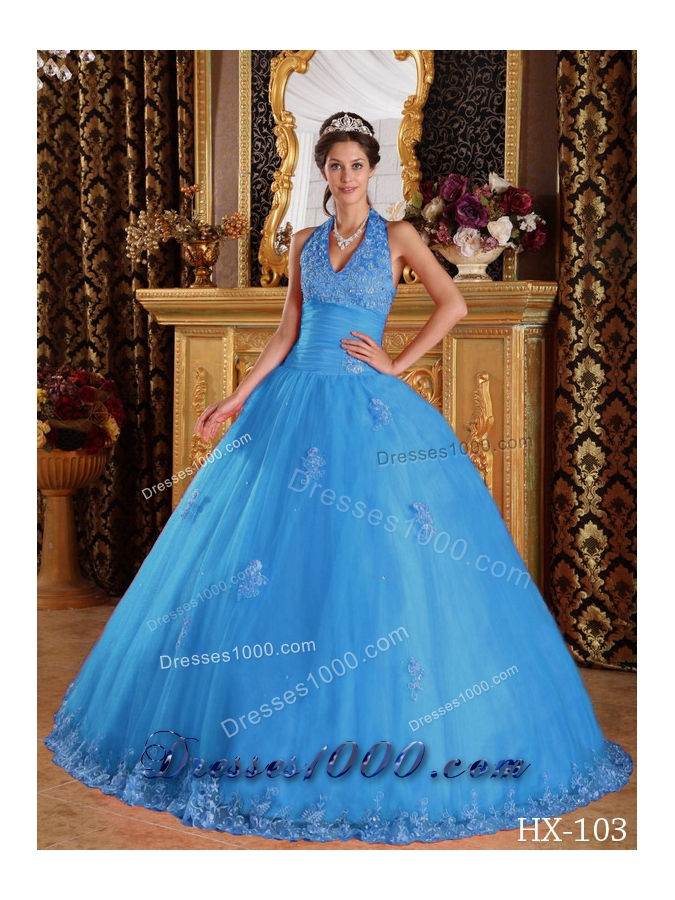 2014 Baby Blue Puffy Halter Appliques Tulle Quinceanera Dress with Beading