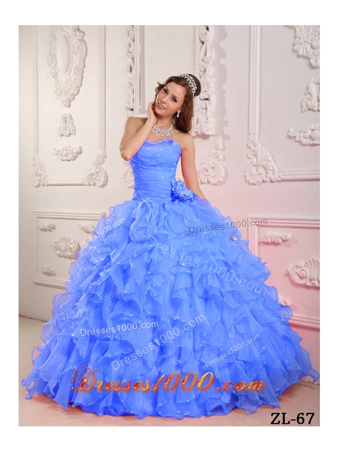 Blue Romantic Puffy Sweetheart Beading Quinceanera Dress with Hand Made Flower