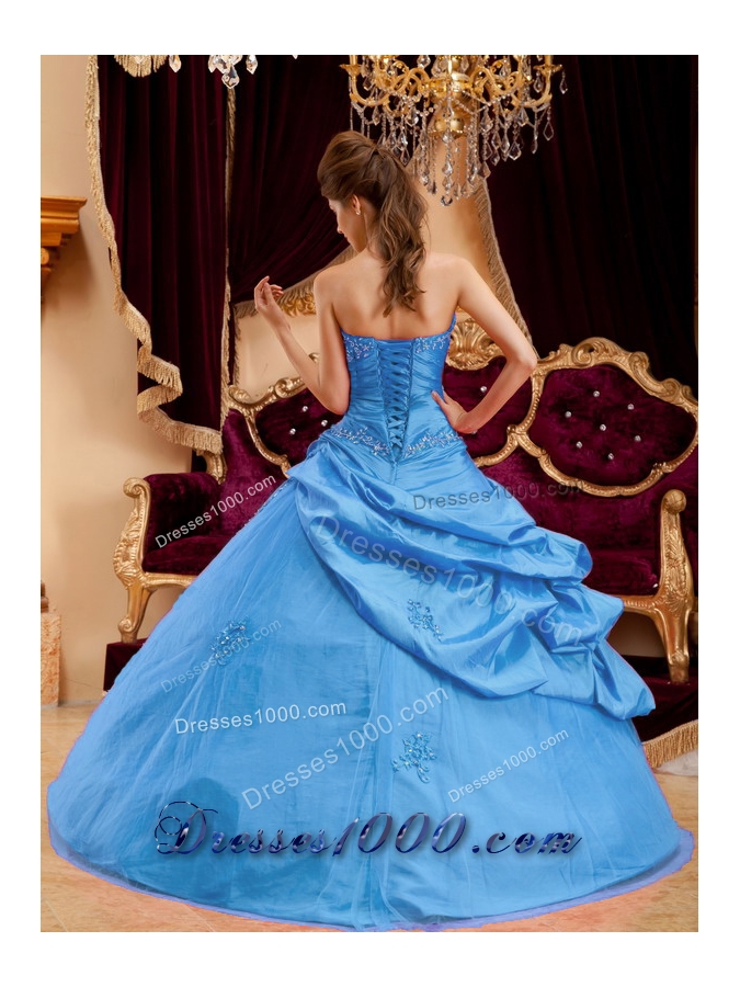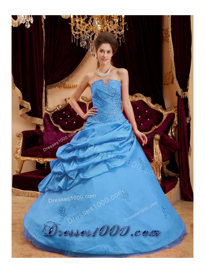 2014 Aqua Blue Puffy Strapless Appliques Quinceanera Dress with Pick-ups