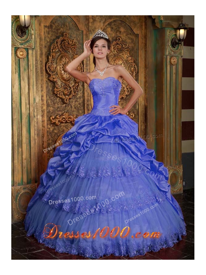 A pretty quinceanera gown features with a sweetheart neckline skirt and a ruffled skirt,the dress looks gorgeous and elegant. The bodice defined with beads achieve a fine look. The gown includes the out layer of ruffled taffeta and inner layers of tulle, the tulle layers own a lace edge add it's beauty.A lace up corset style closure in the back secures the dress in place.A stunning dress for those occasions when you really want to 'wow' the crowd.