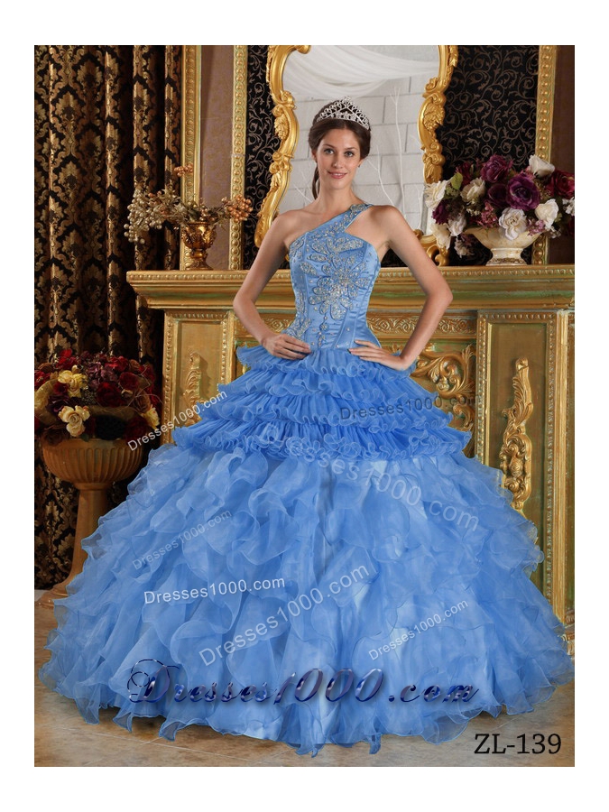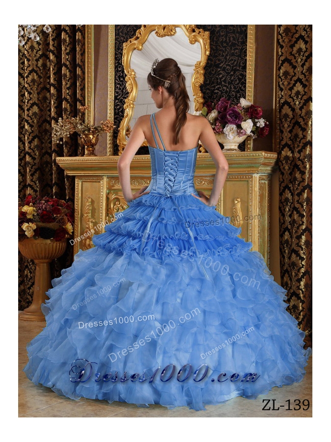2014 Beautiful Blue Puffy One Shoulder Quinceanera Dress with Beading and Ruffled Layers