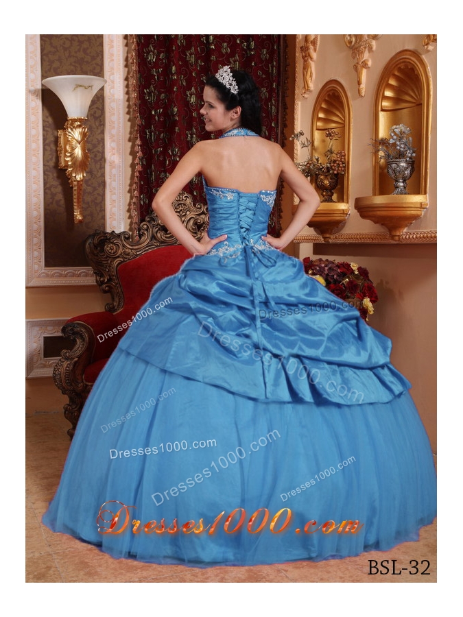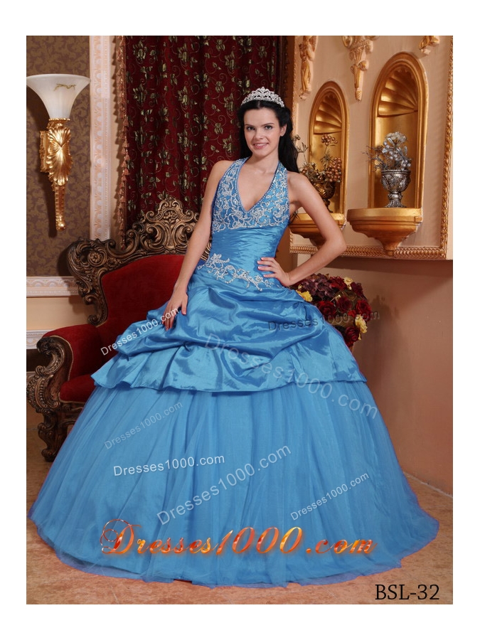 2014 Exclusive Aqua Blue Puffy Halter Appliques Quinceanera Dress with Pick-ups