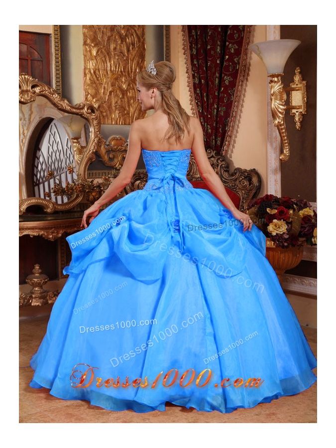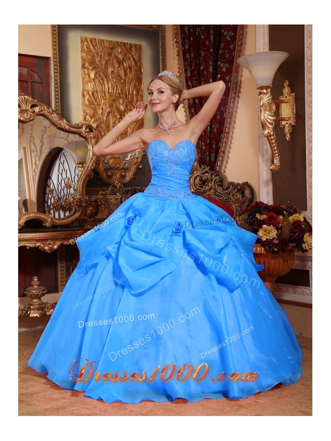 2014 Aqua Blue Puffy Sweetheart Appliques Quinceanera Dress with Pick-ups and Hand Made Flower