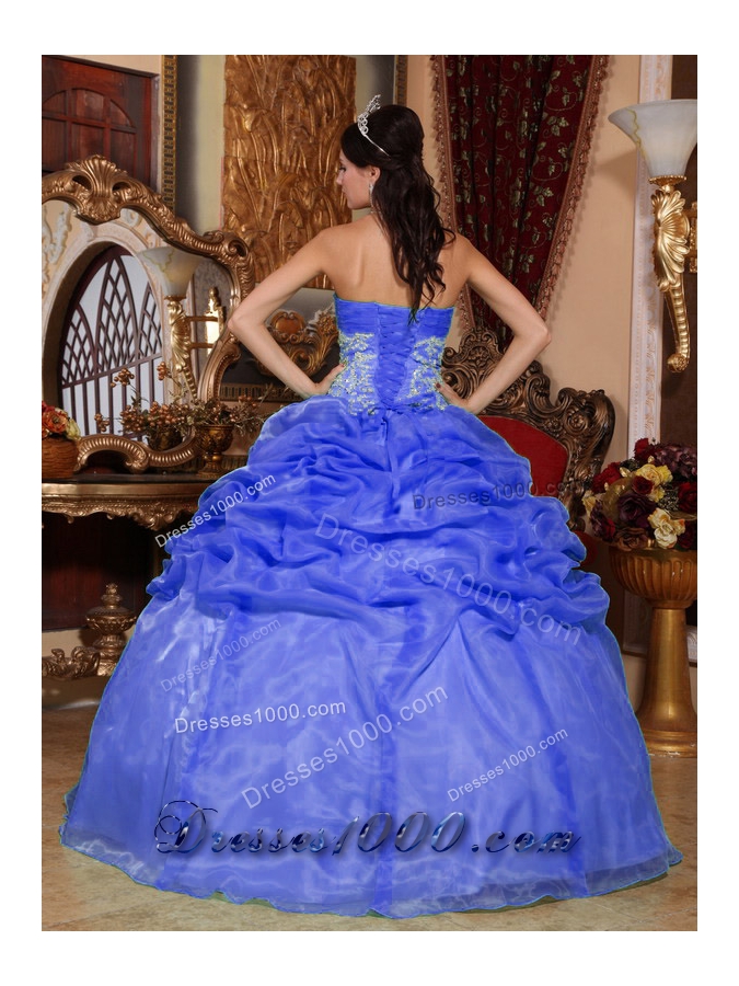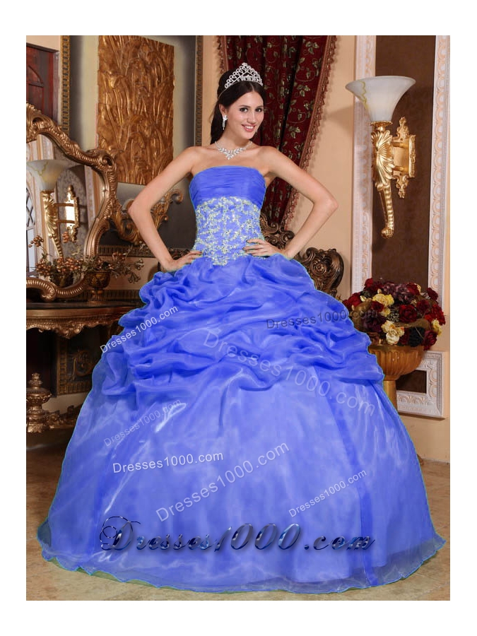 Modest Blue Puffy Strapless for 2014 Appliques Quinceanera Dress with Pick-ups