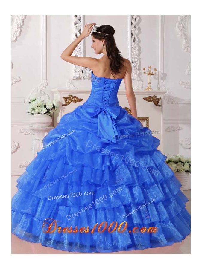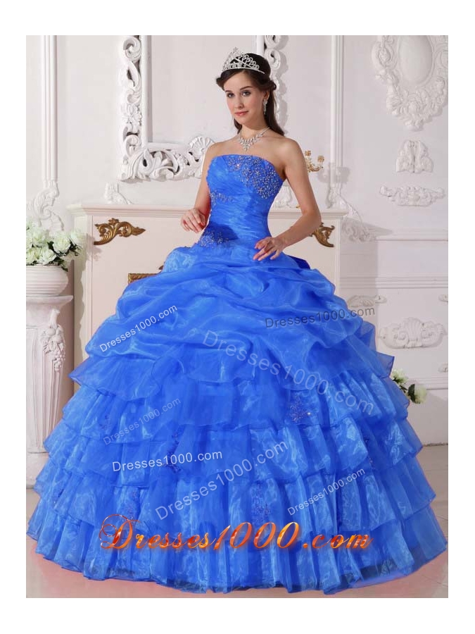 Affordable Blue Pick-ups Strapless for 2014 Appliques Quinceanera Dress with Ruffled Layers