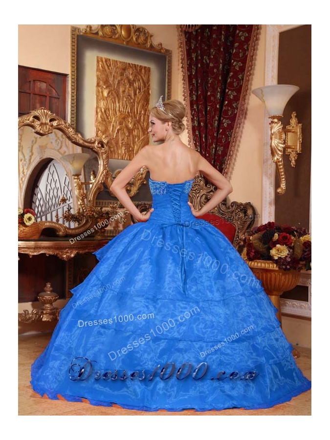 This gorgeous quinceanera gown features a strapless neckline with the bust area accented with embroidery appliques. The ruched bodice curves the waistline .The full skirt suits most of figures and is processed with tiers of organza. Emboidery appliques scattering on the puffy skirt enables the skirt to be more beautiful.The back is fitted with lace up ties.