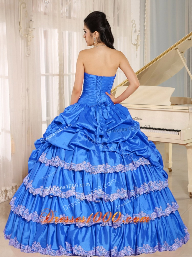 If you're longing for the romantic and heavily detailed gowns of quinceanera, this one may be just what you're looking for. It has a strapless bodice with a gorgeous sweetheart neckline and gorgeous appliques around the bust and waist with beaded embellishment while the skirt of the gown is really a throwback from an earlier time and contains elements of different eras. The shape of the skirt resembles the hoop-style ones worn in the antebellum south while the ruched ruffled tier is more modern, but still has a vintage feel about it. The skirt is hemmed with beautiful lace that complement the dress perfectly.