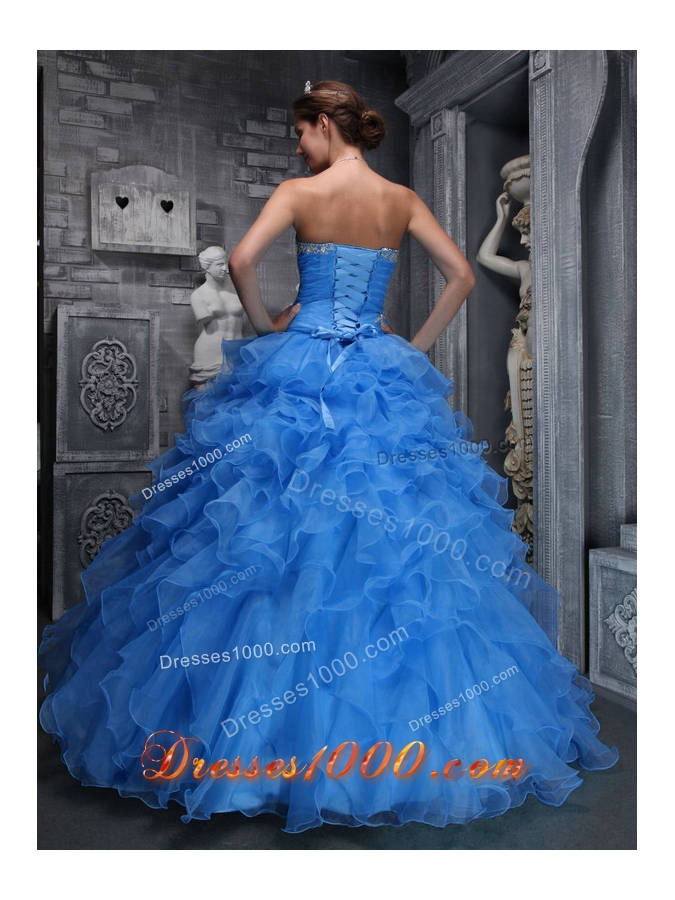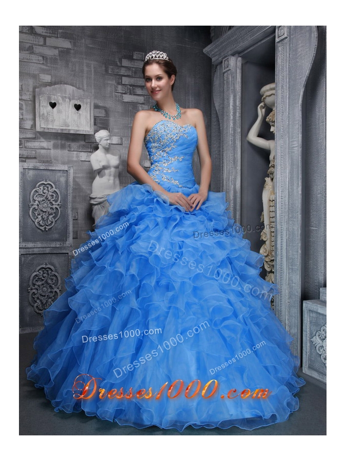 You will catch everyone's attention at the party in this blue quinceanera dress. It features a bodice with a sweetheart neckline that's embellished with pretty appliques.The skirt is consists of many ruffles that create an absolutely beautiful effect in the skirt.This blue quinceanera dress is simple yet delicate. It is a great choice for you. You will be the princess in the fairy tale in this dress.