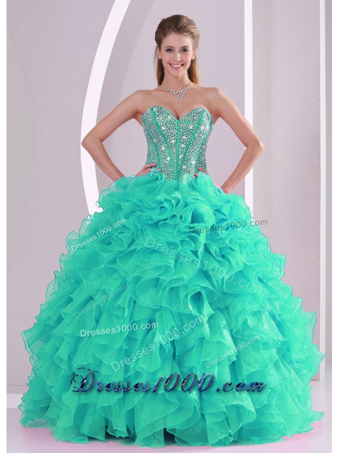 Fall Ball Gown Sweetheart Ruffles and Beaded Decorate Turquoise Quinceanera Gowns