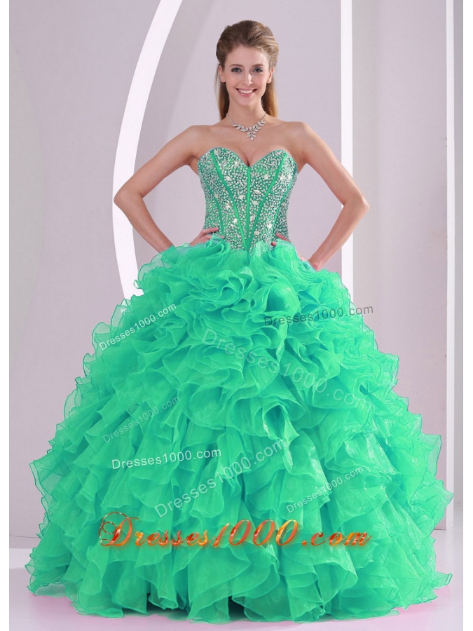 Green Ball Gown Sweetheart Ruffles and Beading Long Quinceanera Gowns in Sweet 16