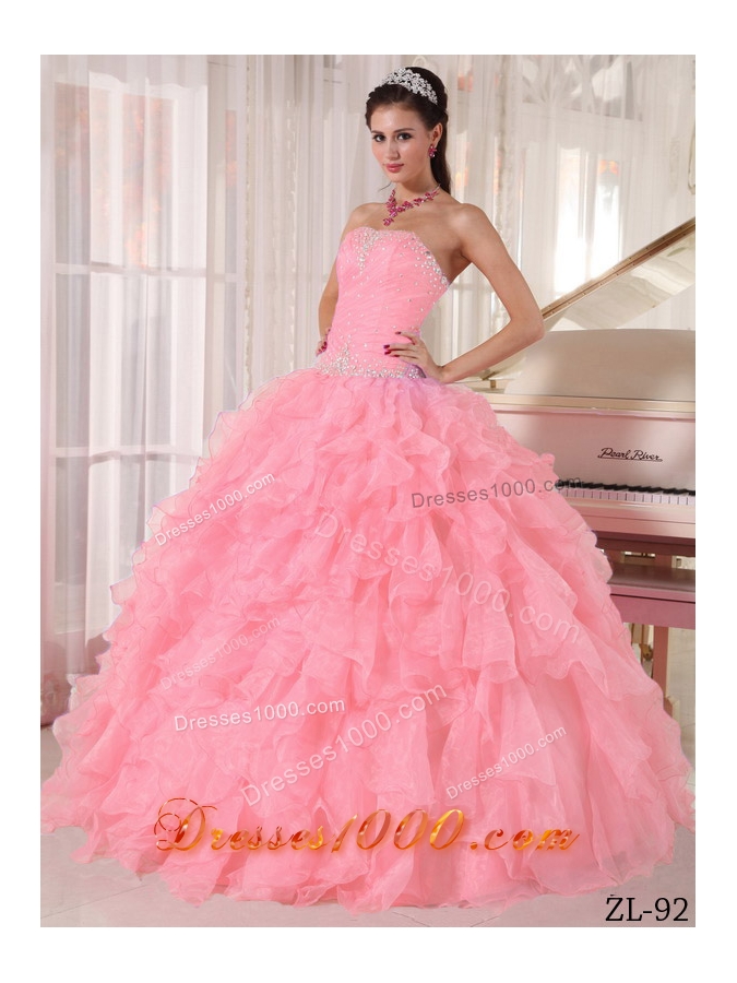 Pink Ball Gown Strapless Floor-length Organza Beading Quinceanera Dress