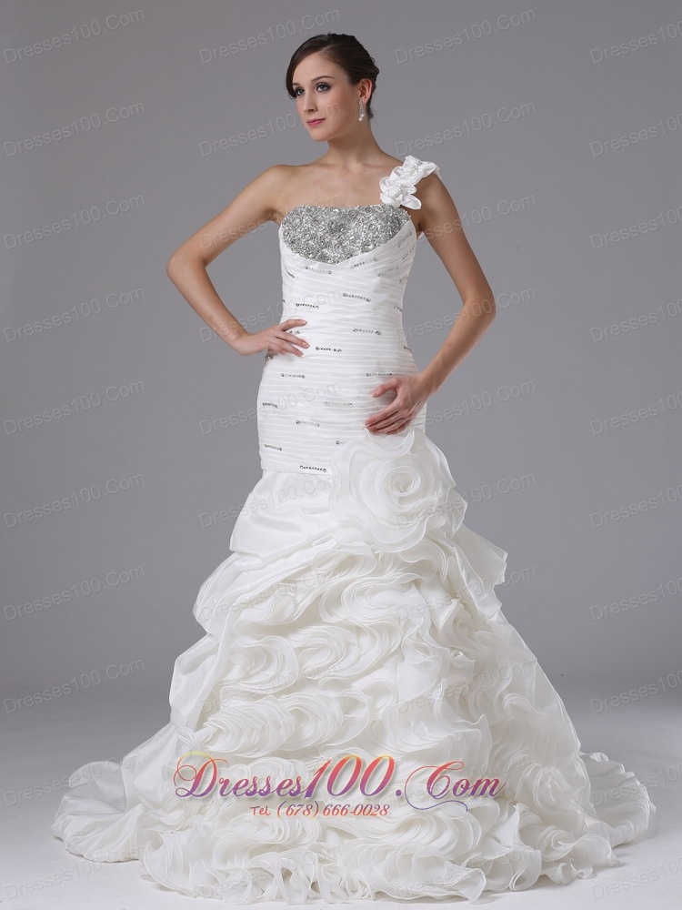 One Shouler Rolling Flower Mermaid Wedding Gown Ruched Beading