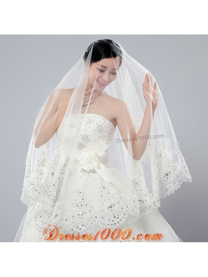 2014 Cheap Two-Tier White Fingertip Veil with Lace Edge