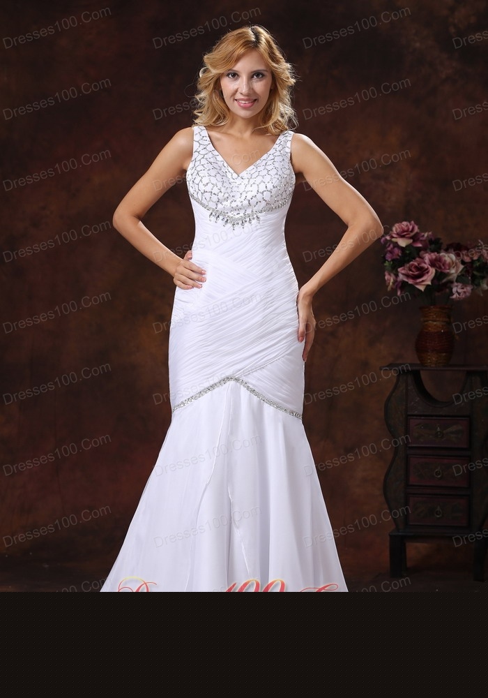 This white wedding dress is simply gorgeous! The ruched close-fitting bodice is encrusted with exquisite beading and sexy V-neck with two embroidered wide straps. The A-line skirt opens with folds and stretches out to be a charming train. The special designed back is made of the straps accented with delicate embroidery and button closure which creates a shape of Y. You will be a most beautiful bride in this dress!