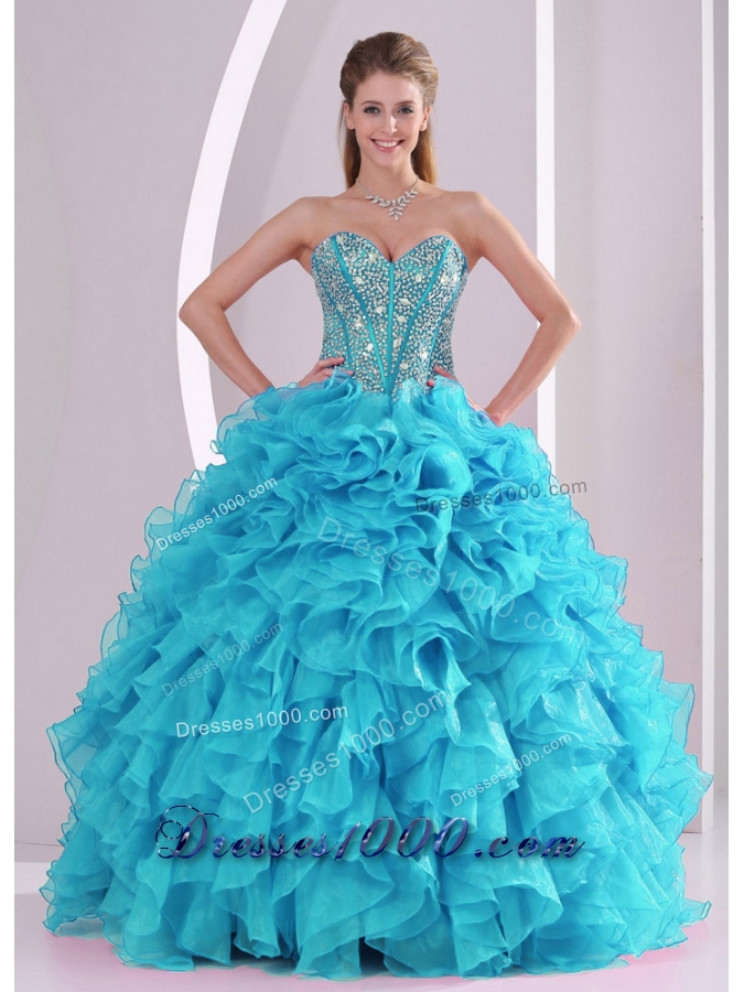 Blue Sweetheart Ruffles and Beaded Decorate Sleeveless Quinceanera Gowns