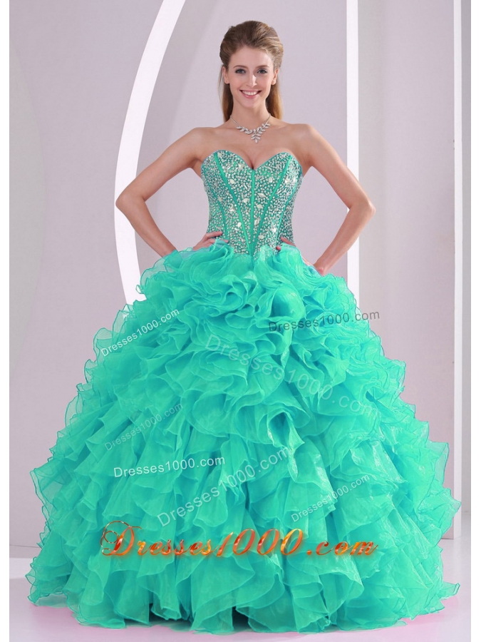 Fall Ball Gown Sweetheart Ruffles and Beaded Decorate Turquoise Quinceanera Gowns