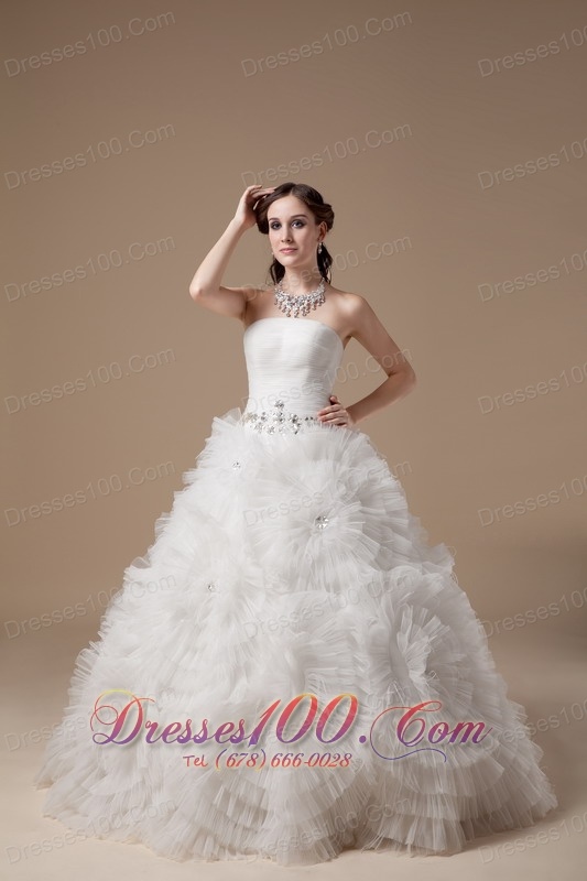Do you want to be the special and attractive bride? Your dream will come true when you wear this dress. The fitted, strapless bodice made of an all-over ruches. The beadings and the sequins adorn the waistline. The big flower embellishment complete the skirt. A lace up makes for easy off and on and secures the dress in place.