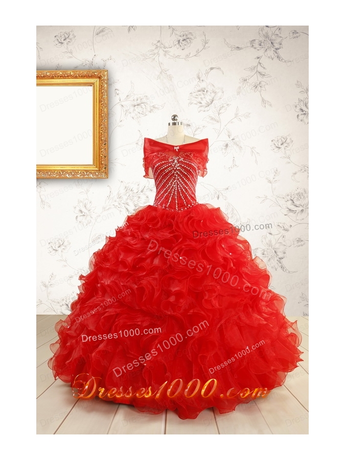 Exquisite Beading and Ruffles Red Quinceanera Gowns with Wrap for 2015