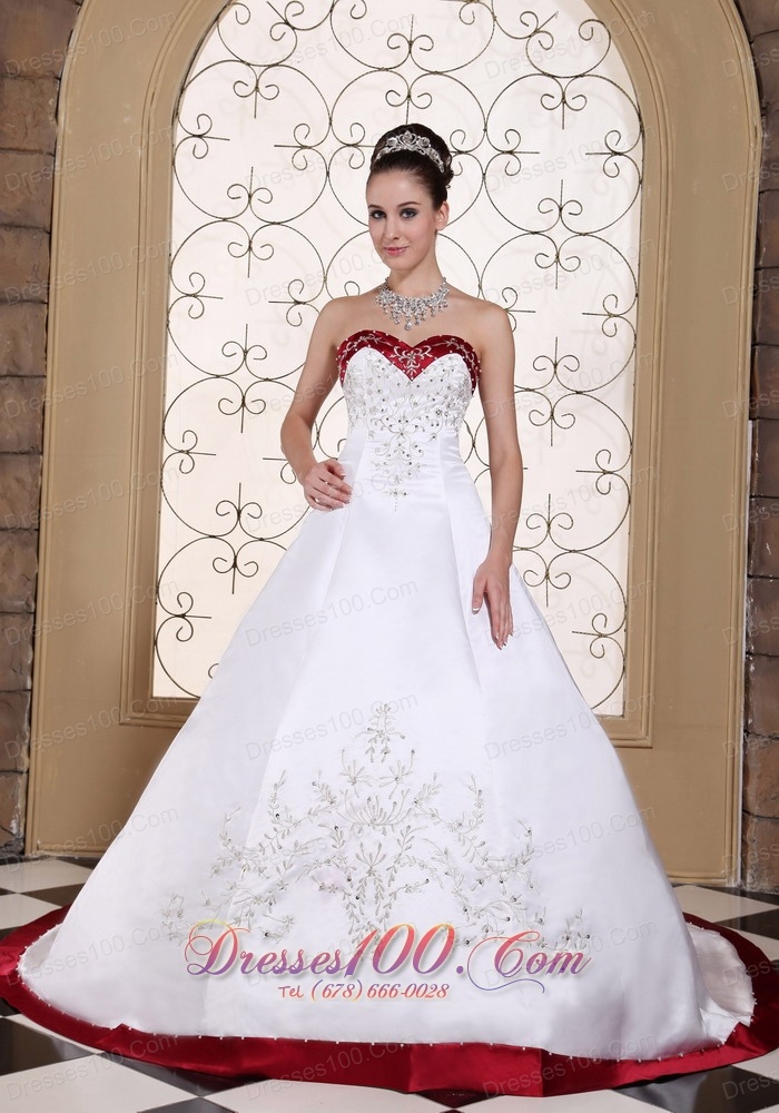 You will be a real surprise in this elegant wedding dress for your husband and other people! The torso features a sweetheart neckline hemmed with red fabric adorned with embroidery and beading which beautify the dress. The A-line skirt is embellished with floral embroidery and beading and has a red hem, which makes you a pricess. The lace up back and embroidery in the red satin separately streaming to the hem finish overall look.