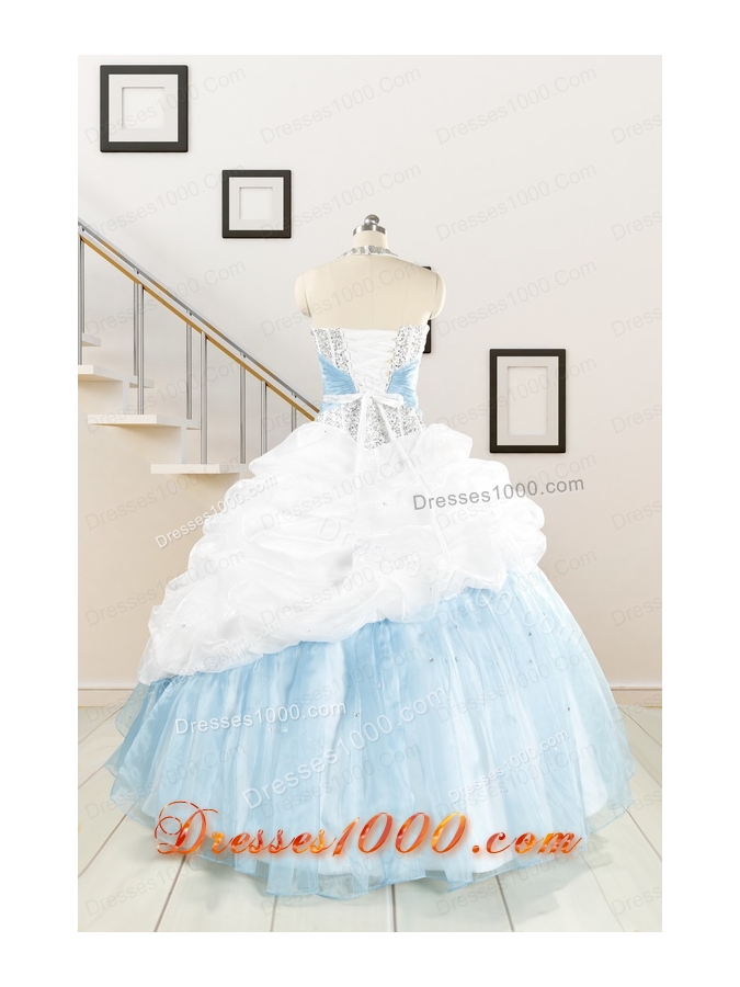 2015 Pretty Halter White and Blue Quinceanera Dress with Beading