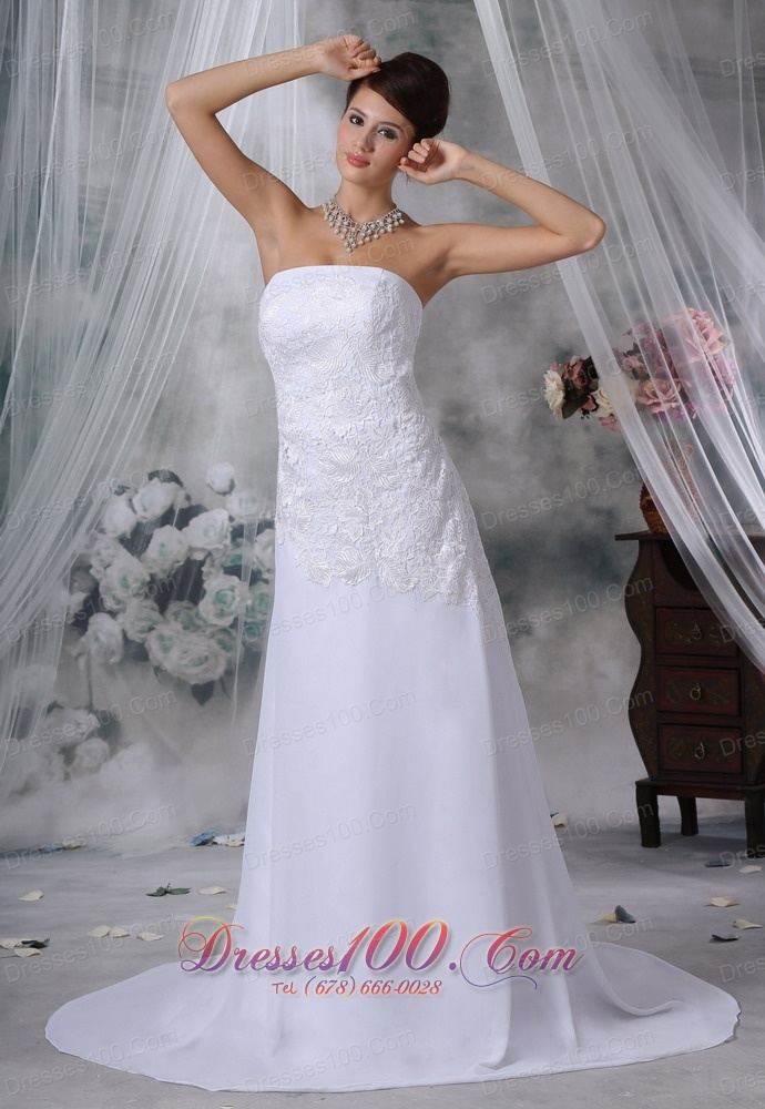 Strapless Lace Decorate Court Train Chiffon Voicedress