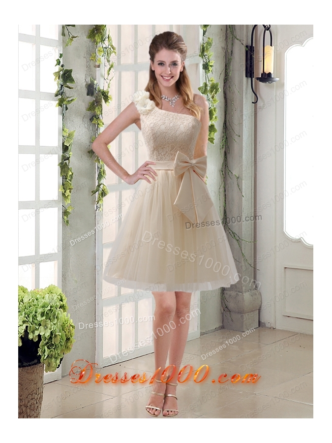 2015 Princess One Shoulder Bowknot Lace Prom Dresses in Champagne