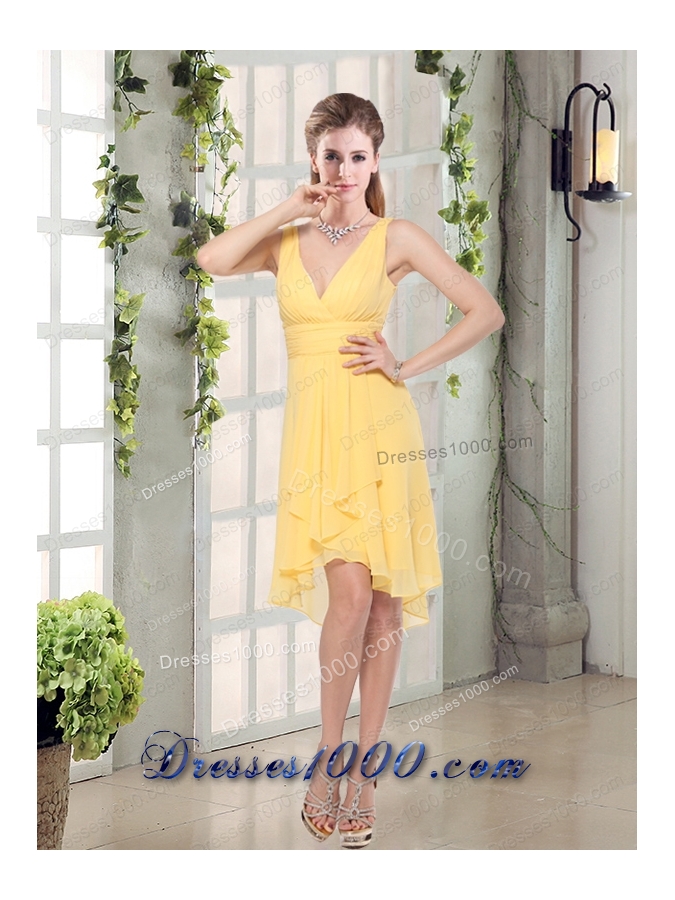 Charming V-neck Yellow Prom Dress Mini Length for Spring