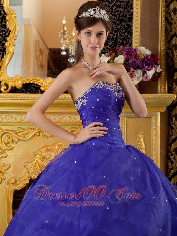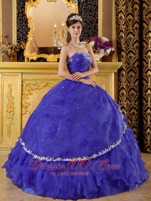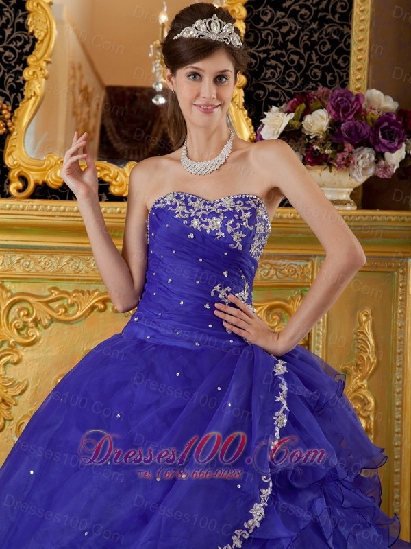 A romantic blue quinceanera gown features a sweetheat neckline and a pleated bodice sharply show your girly beauty. The appliques and sequins scattered intricately on the dress add the fine look and shinning effect.The skirt accent heavy ruffles and a out split tulle layer add the sassy and lovely of the dress. A lace up corset style closure in the back secures the dress in place. Dressing the dress makes you feel like a princess.
