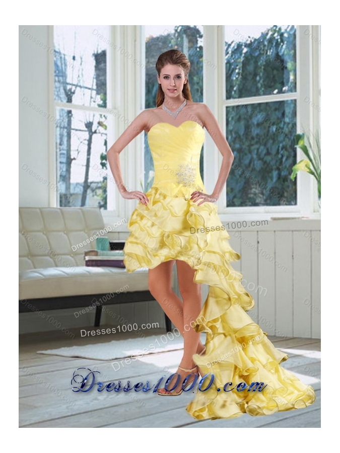 Beautiful Light Yellow Sweetheart High Low Prom Dress with Beading and Ruffled Layers
