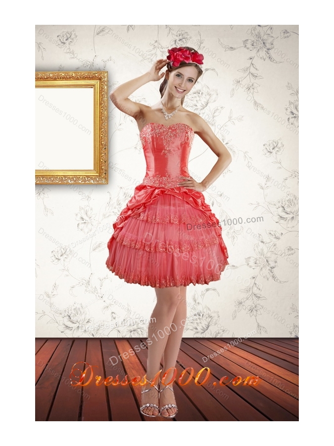 2015 Beautiful Strapless Coral Red Prom Gown with Ruffled Layers