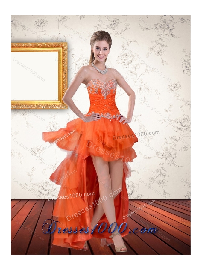 Elegant High Low Sweetheart Orange Prom Dresses with Ruffles and Beading