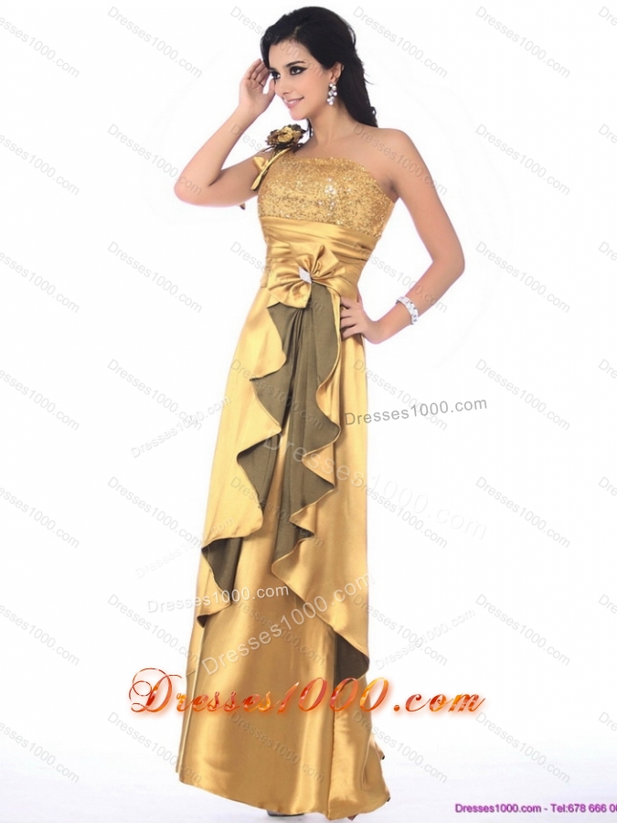 Gorgeous One Shoulder Gold Prom Dress with Hand Made Flowers and Ruching