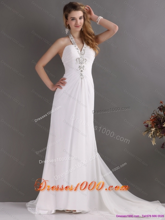 Beautiful 2015 Halter Top White Prom Dress with Ruching and Beading
