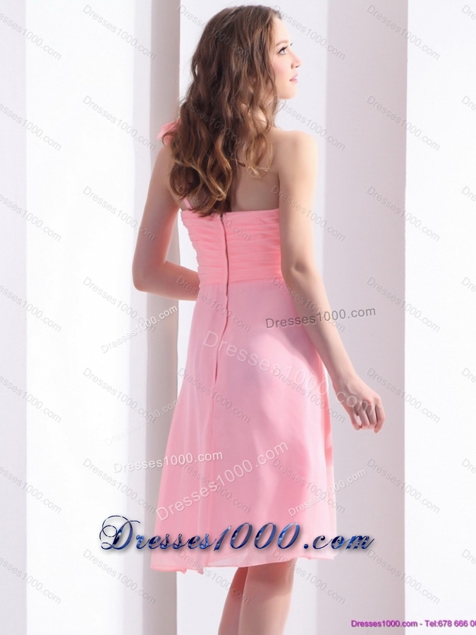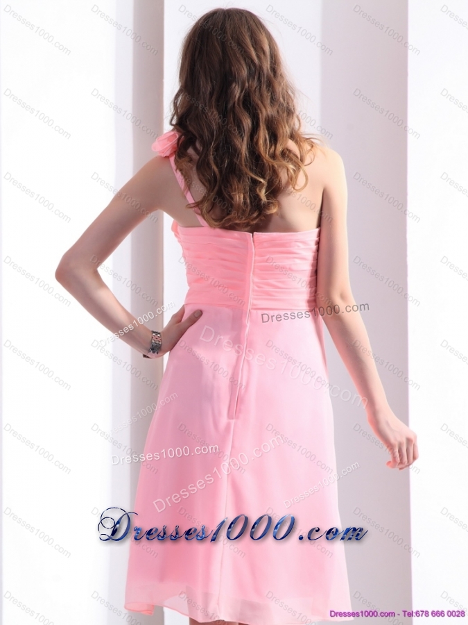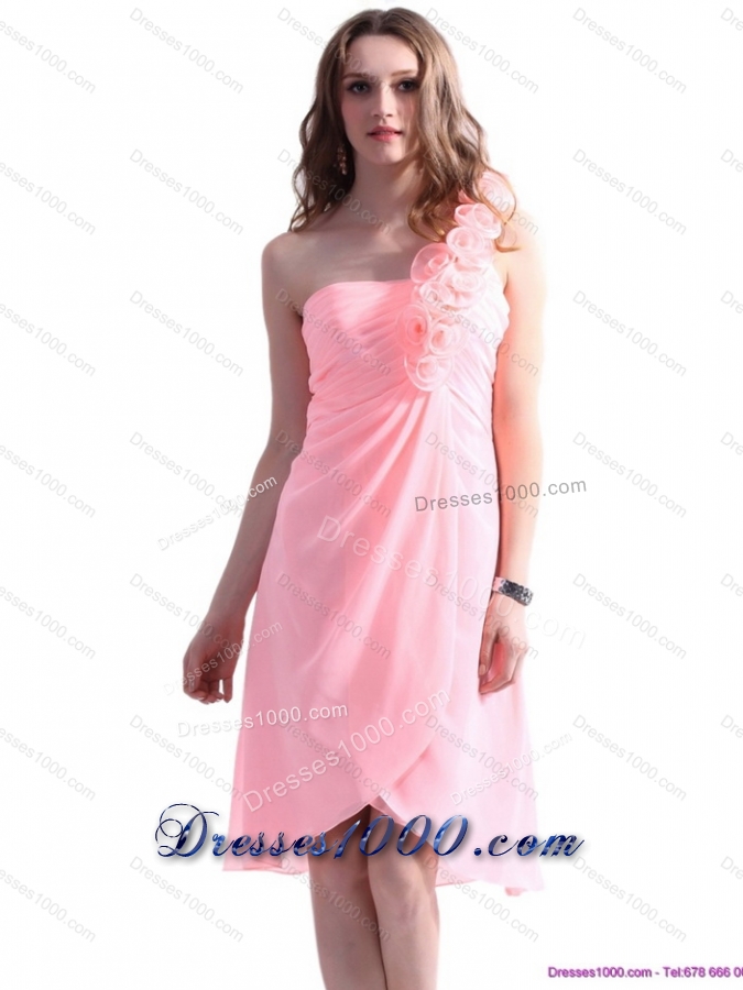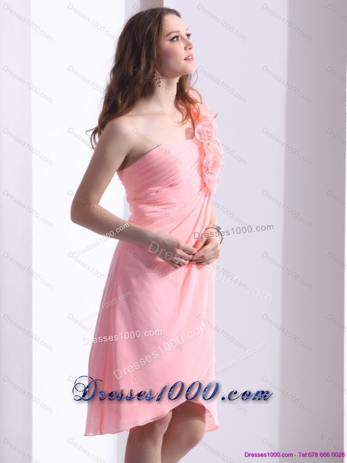 2015 Baby Pink One Shoulder Prom Dresses with Ruching and Hand Made Flowers