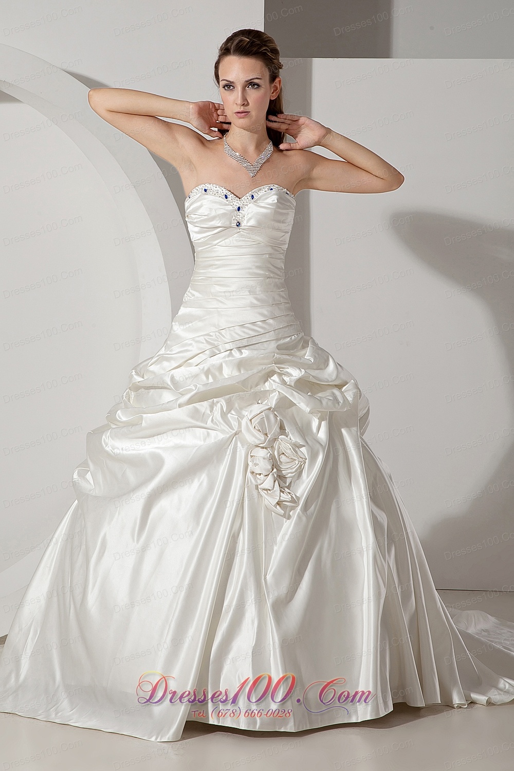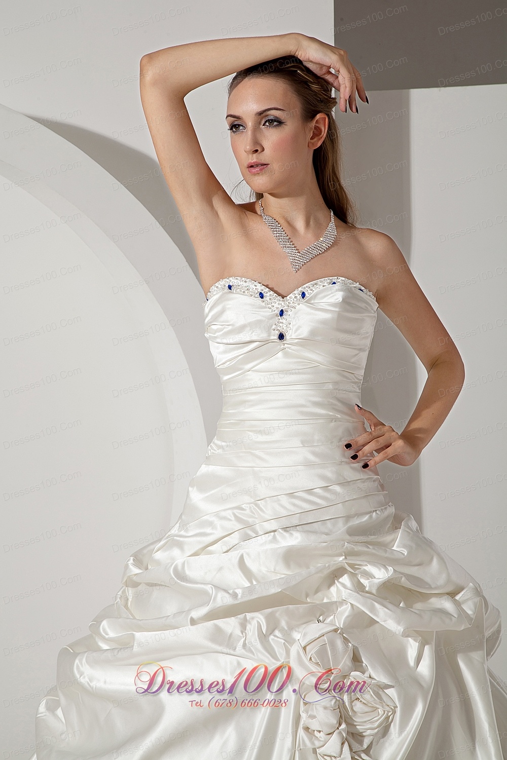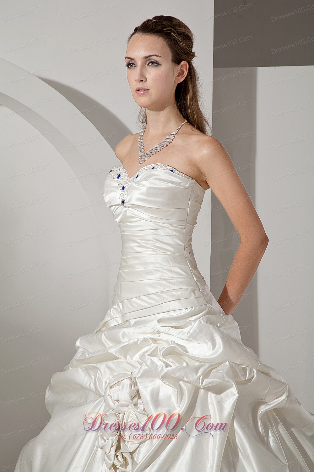 A ravishing array of tucks shapes the strapless bodice of this radiant wedding gown.Delicate, ruched material stretches all over the sweetheart bodice trimmed by glittering royal blue crystals.Beautiful ruffles at the midriff and fabric flowers in full glory bloom under the dropped waistand sculpt classic curves. The flared, floor-length skirt with a dramatic sweep length train at the back finishes off this elegant and exquisite design.