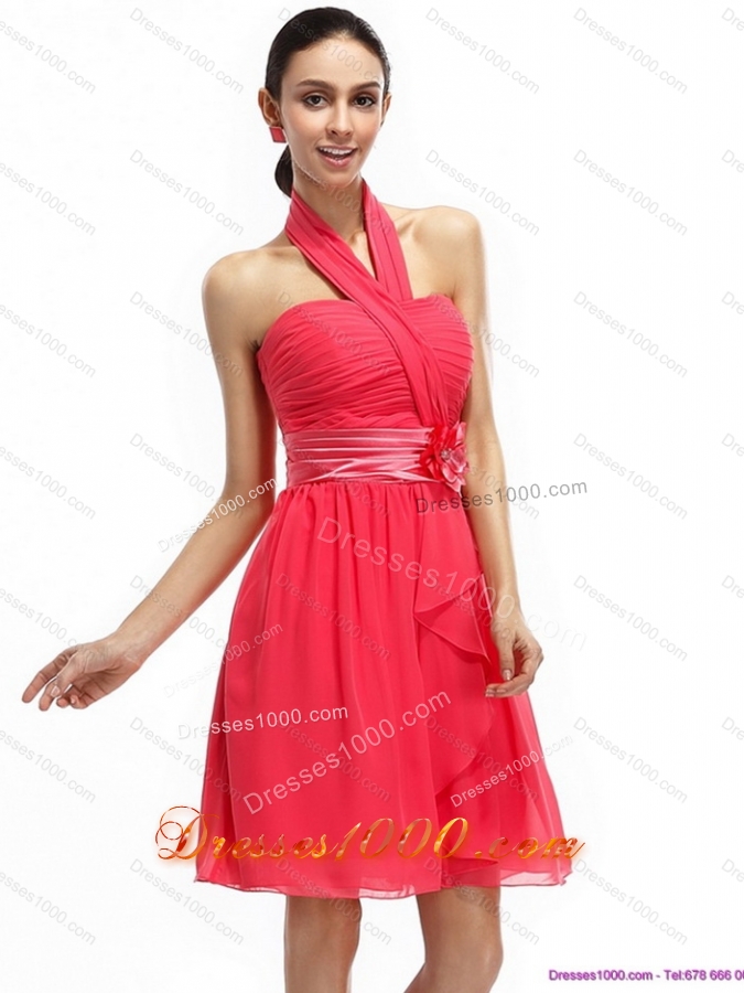 2015 Halter Top Prom Dresses with Ruching and Hand Made Flowers