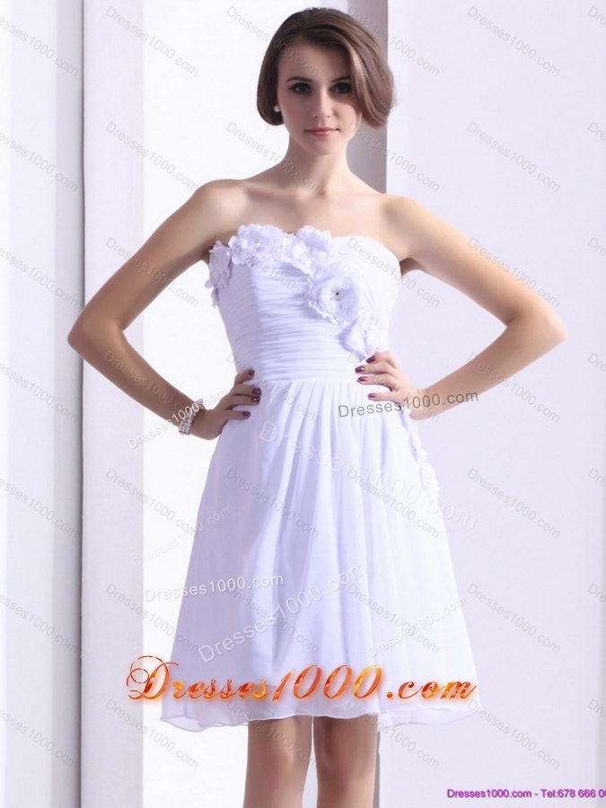 2015 White Strapless Prom Dresses with Ruching and Hand Made Flower