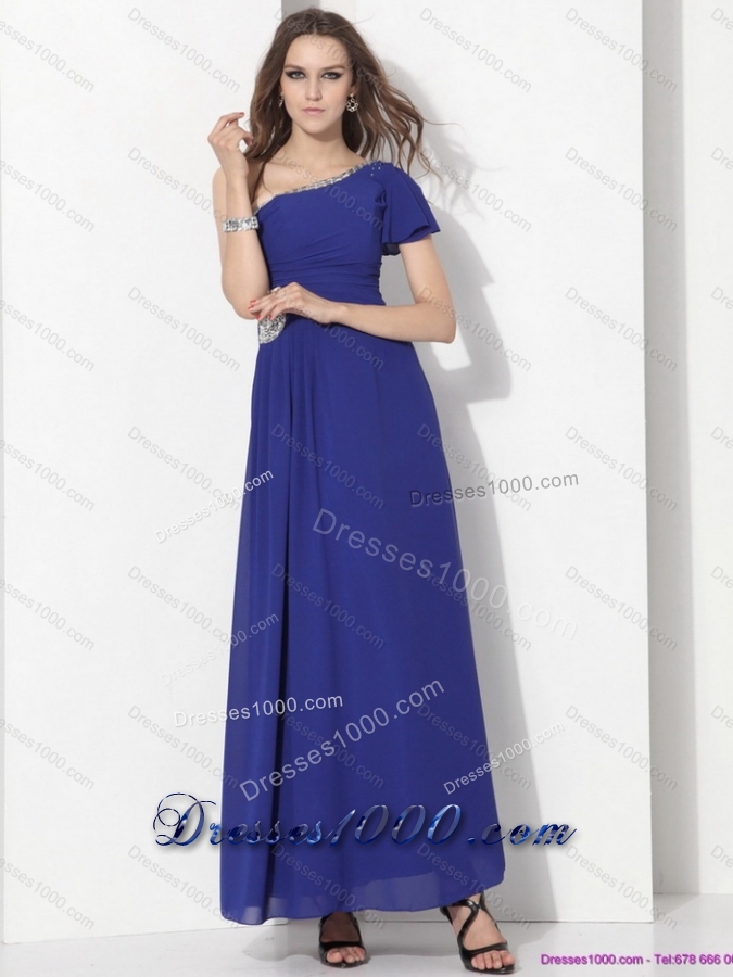 Elegant One Shoulder Blue Prom Dress with Ruching and Beading
