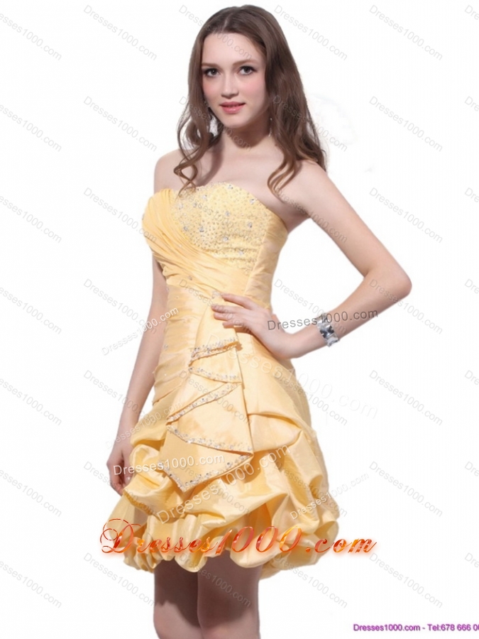 2015 Gold Mini Length Prom Dresses with Beading and Pick Ups