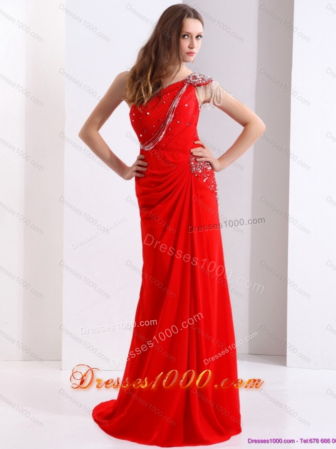 Elegant 2015 One Shoulder Red Prom Dress with Beadings and Brush Train