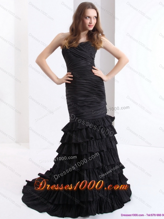 Elegant Brush Train Pleated Black Prom Dresses with One Shoulder and Ruffled Layers