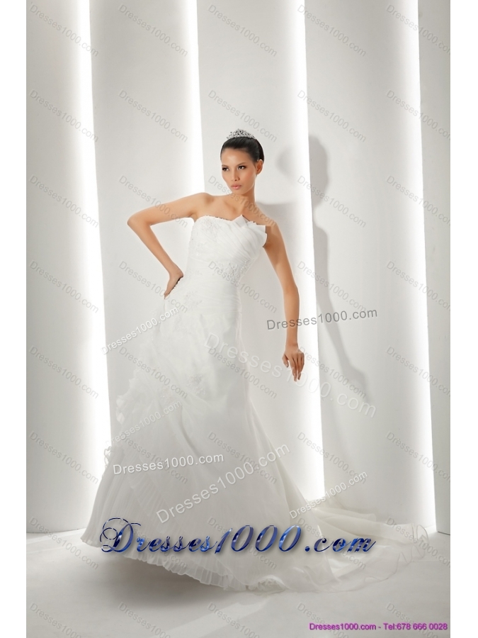 Unique Brush Train Ruching White Wedding Dresses with Appliques for 2015