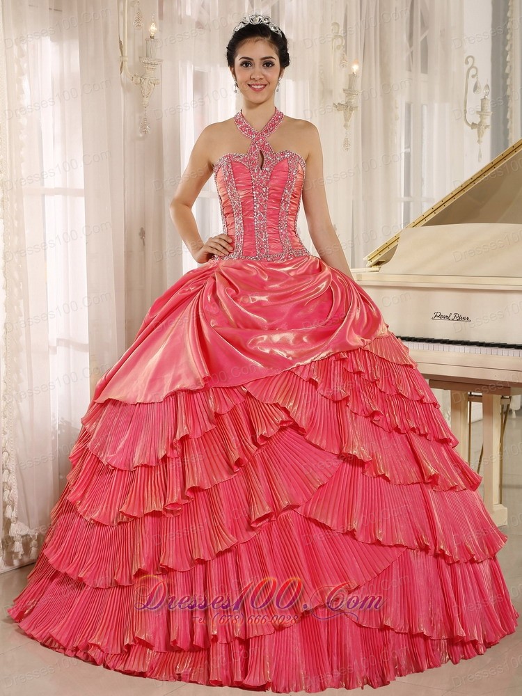 Halter Watermelon Beading and Pleat Quinceanera Gown