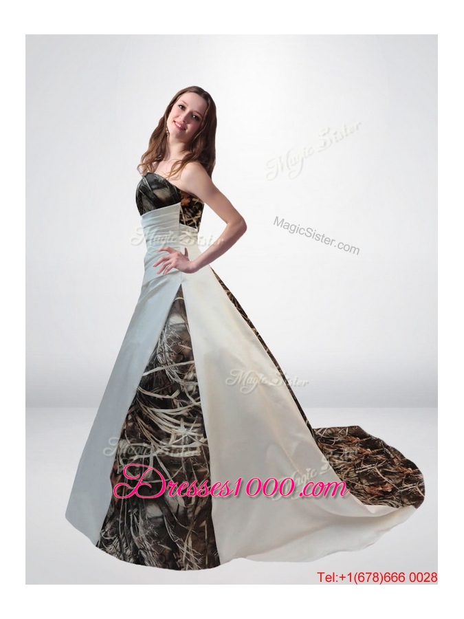 Perfect and Romantic A Line Strapless Camo Wedding Dresses with Chapel Train