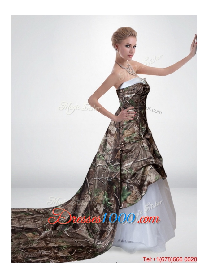 Perfect and Elegant A Line Strapless Camo Wedding Dresses with Court Train