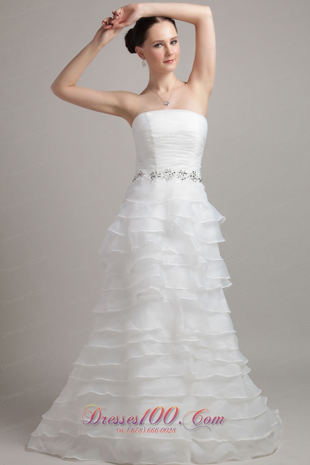 Strapless dresses are one of the sexier styles on the market today. They show just enough skin to be classy without being too revealing. This white dress features a strapless bodice which is decorated with ruchings. The waist is accented with beaded appliques. The all over ruffled skirt with a chapel train completes the wonderful silhouette.